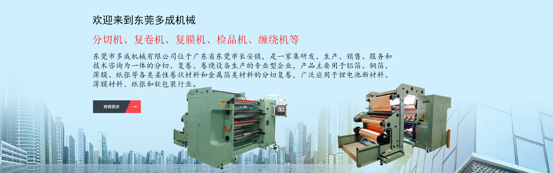 東莞市多成機械有限公司位于廣東省東莞市長安鎮(zhèn),是一家集研發(fā)、生產(chǎn)、銷售、服務(wù)和技術(shù)咨詢?yōu)橐惑w的分切、復卷、卷繞設(shè)備生產(chǎn)的專業(yè)型企業(yè),產(chǎn)品主要用于鋁箔、銅箔、薄膜、紙張等各類柔性卷狀材料和金屬箔類材料的分切復卷,廣泛應用于鋰電池新材料、薄膜材料、紙張和軟包裝行業(yè),產(chǎn)品范圍有分切機、復卷機、復膜機、檢品機、纏繞機等,是國內(nèi)外分切卷繞設(shè)備專業(yè)供應商。